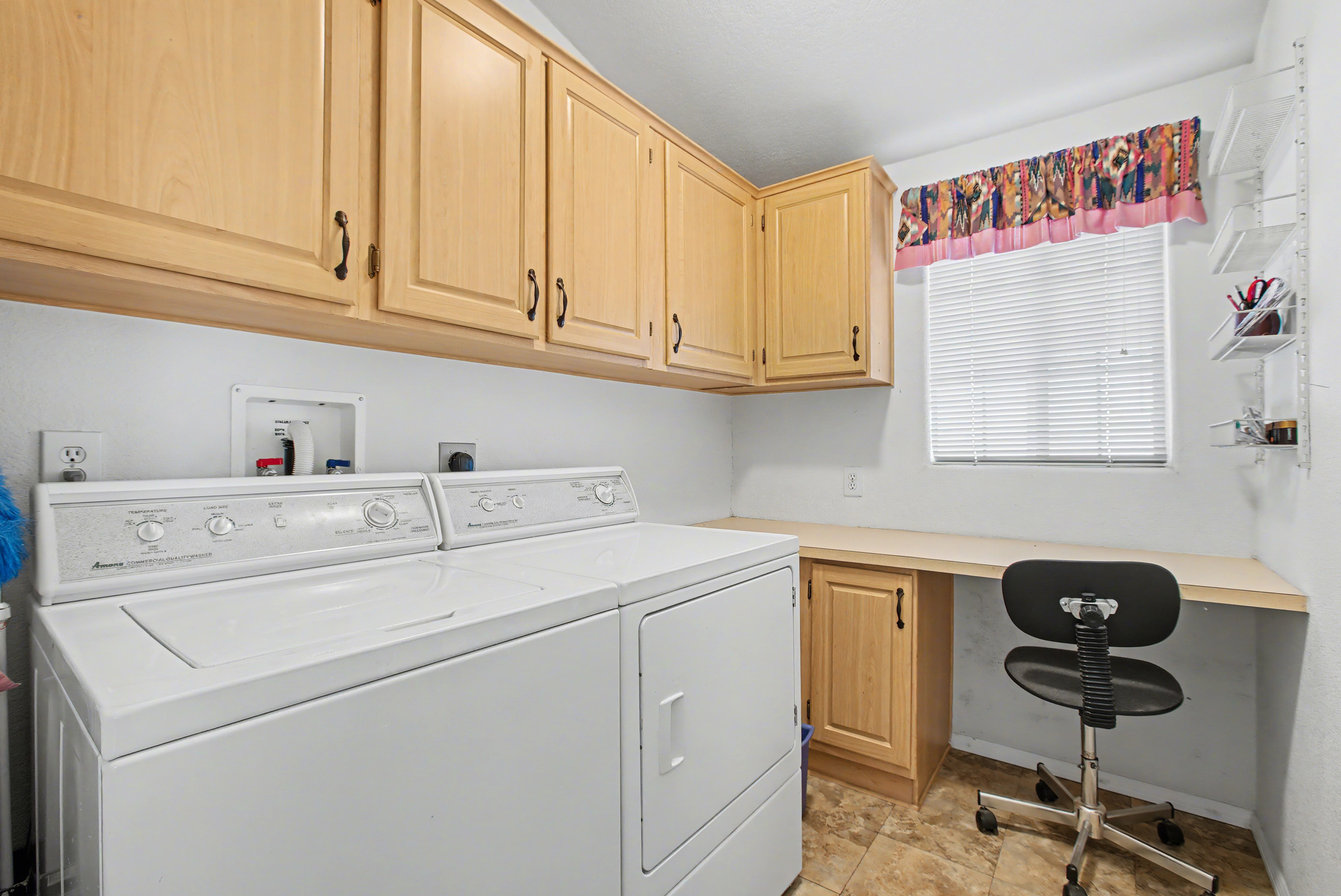- Washer/dryer area, overhead shelf and built-in desk