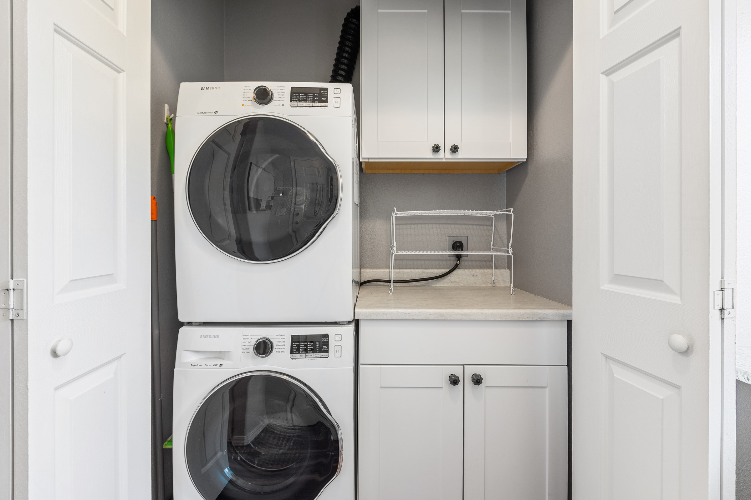 • Washer/dryer area, overhead shelf and built-in desk