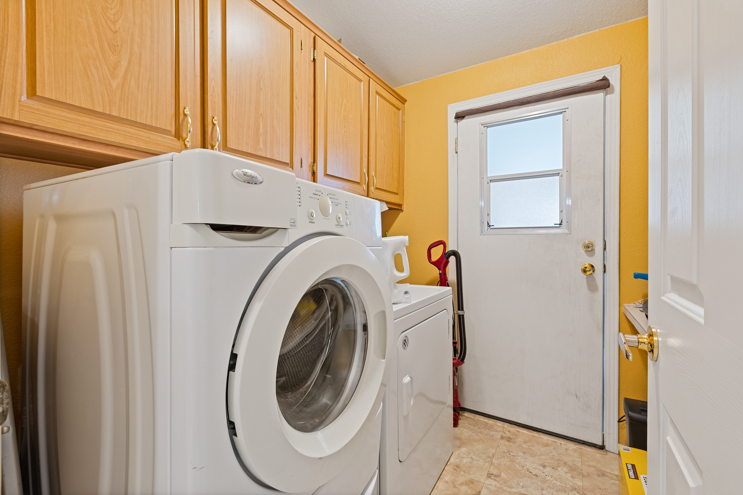 - Washer/dryer area, overhead shelf and built-in desk