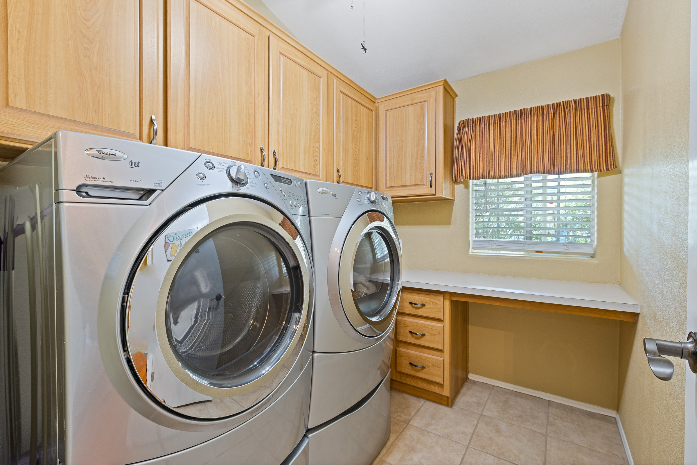 - Washer/dryer area, overhead shelf and built-in desk