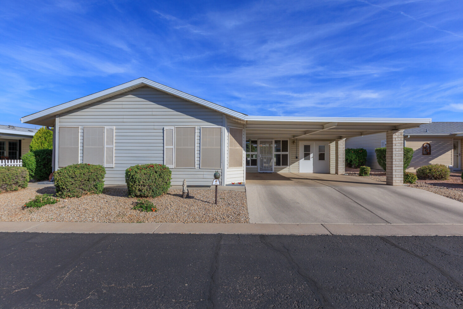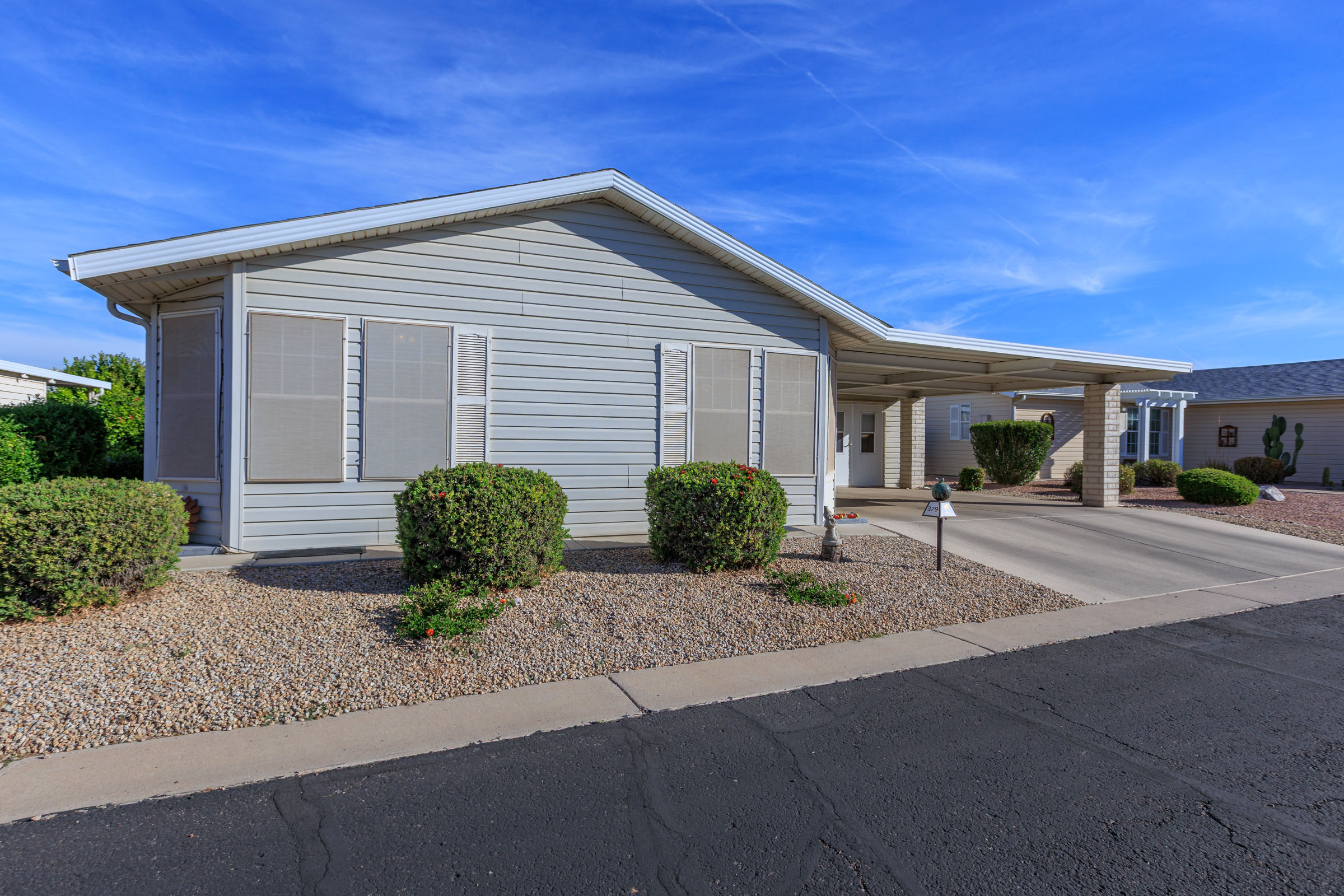 Wow, what a beautifully remodeled home! This 2 bedroom 2 bath OPEN concept home will truly impress! Upon entering, you will see the amazing AZ room with the perfect NE location. Then you enter the home with zero carpet, marble counters and white cabinets through out, awesome great room and a bonus room! This home will surely impress with it’s functional layout and beautiful upgrades throughout! Call today 480-357-5508 for your private tour.