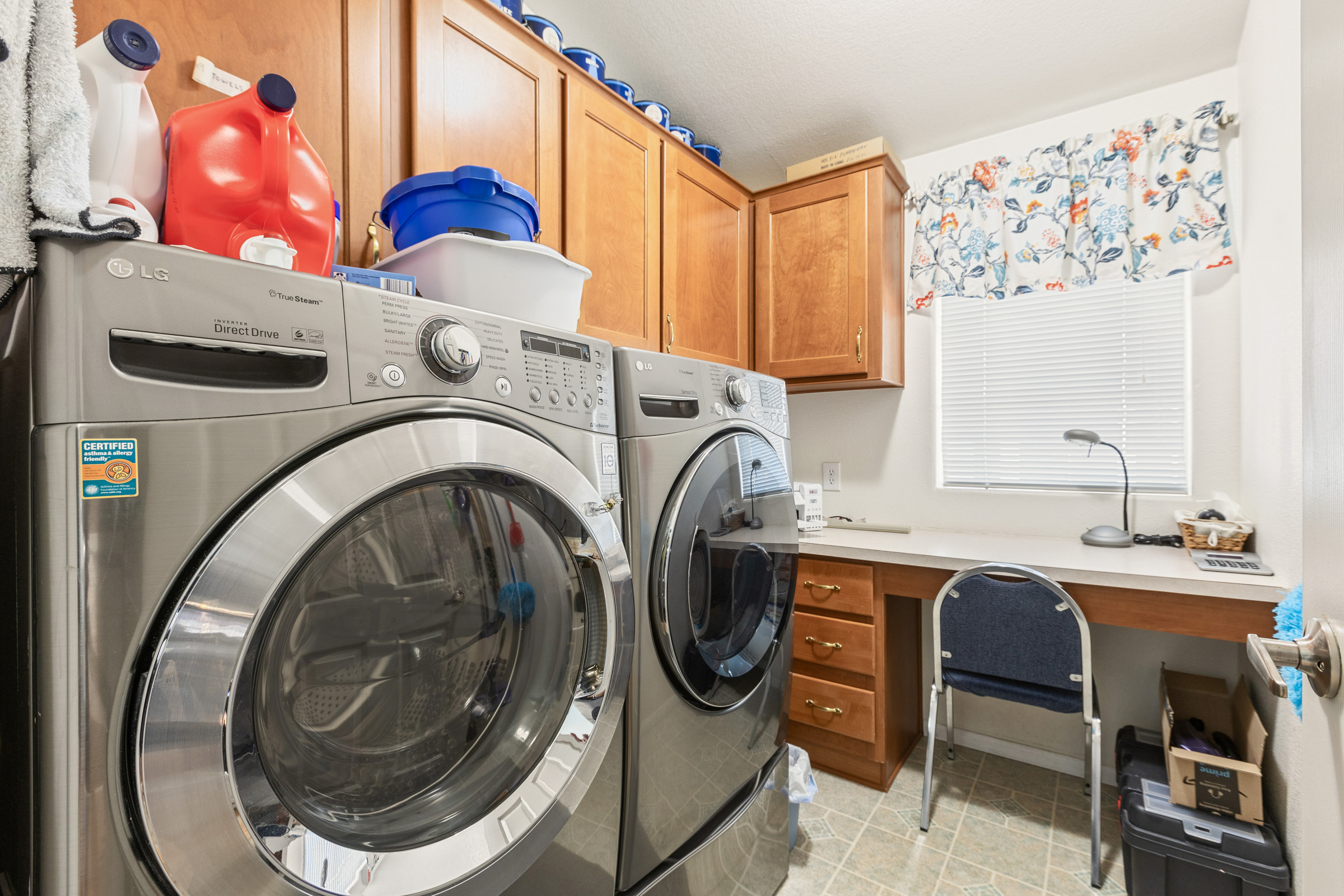 - Washer/dryer area, overhead shelf and built-in desk