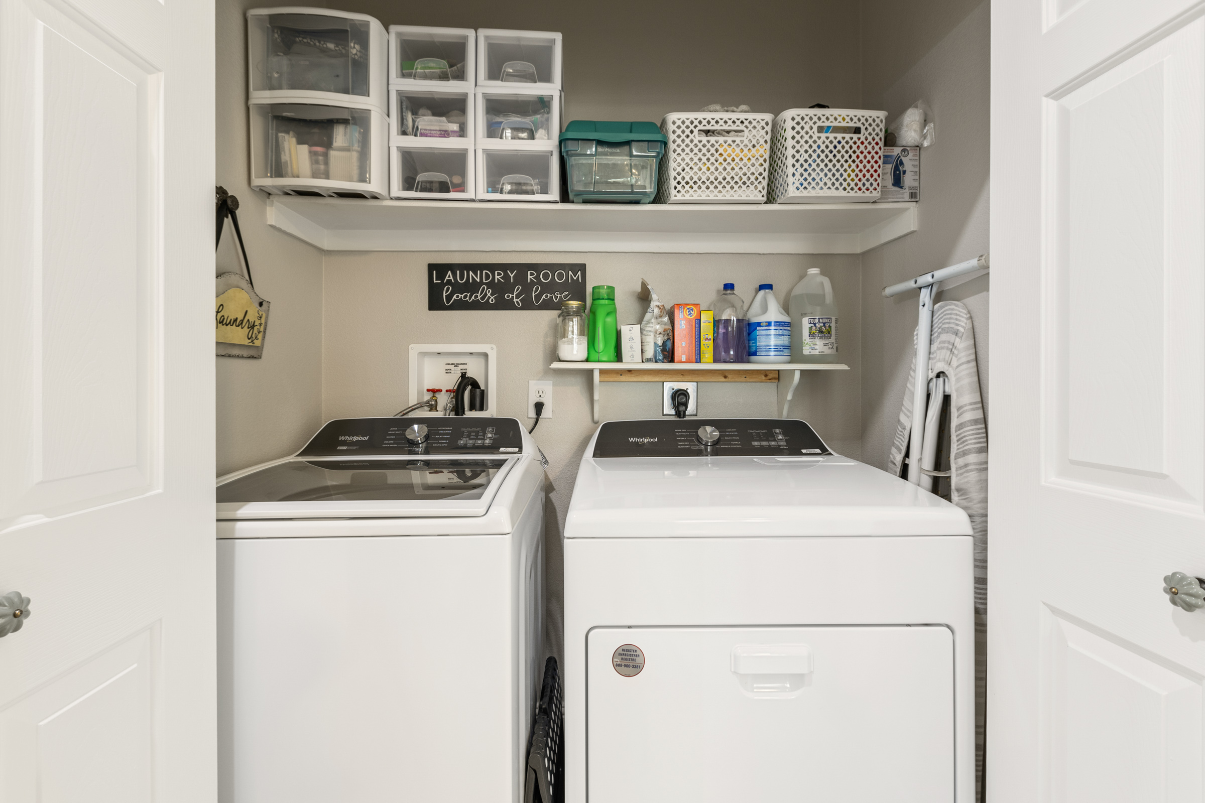 - Washer/dryer area, overhead shelf and built-in desk