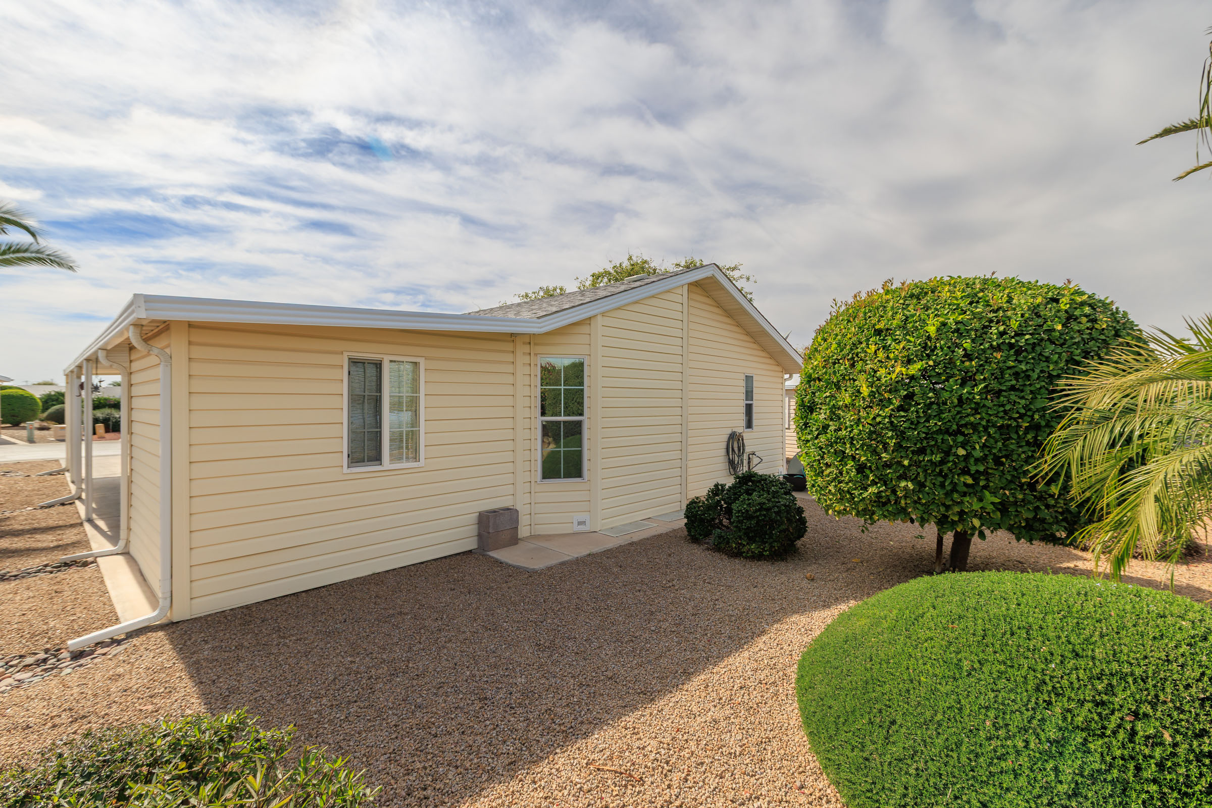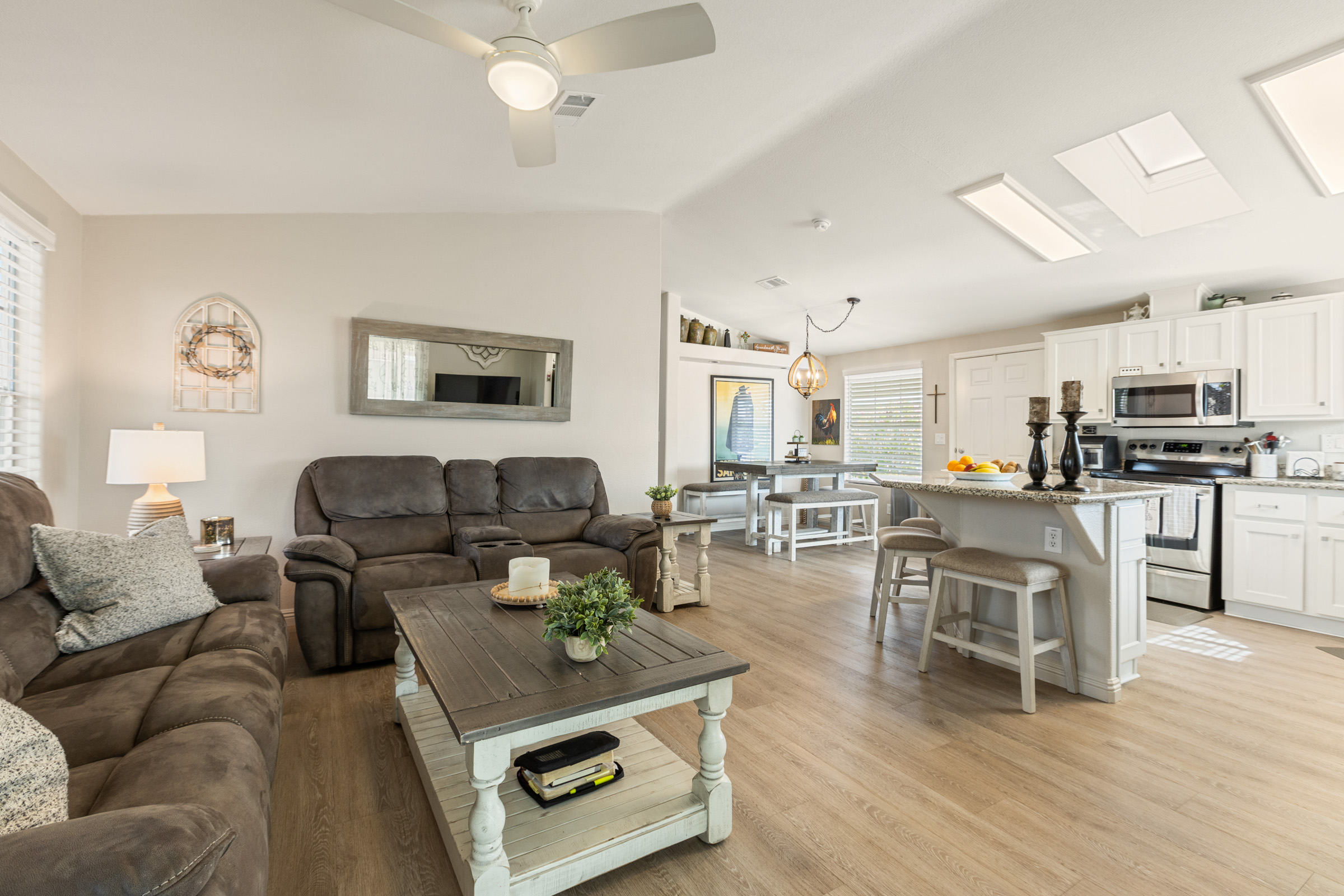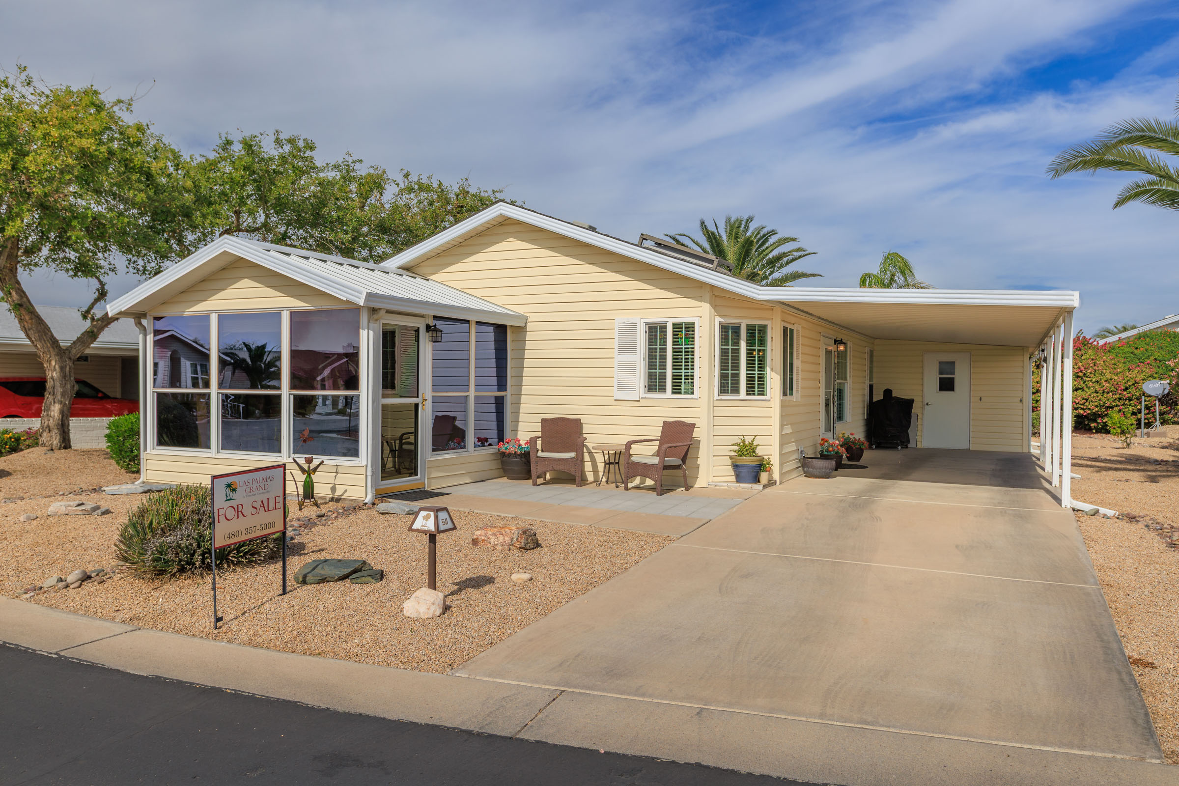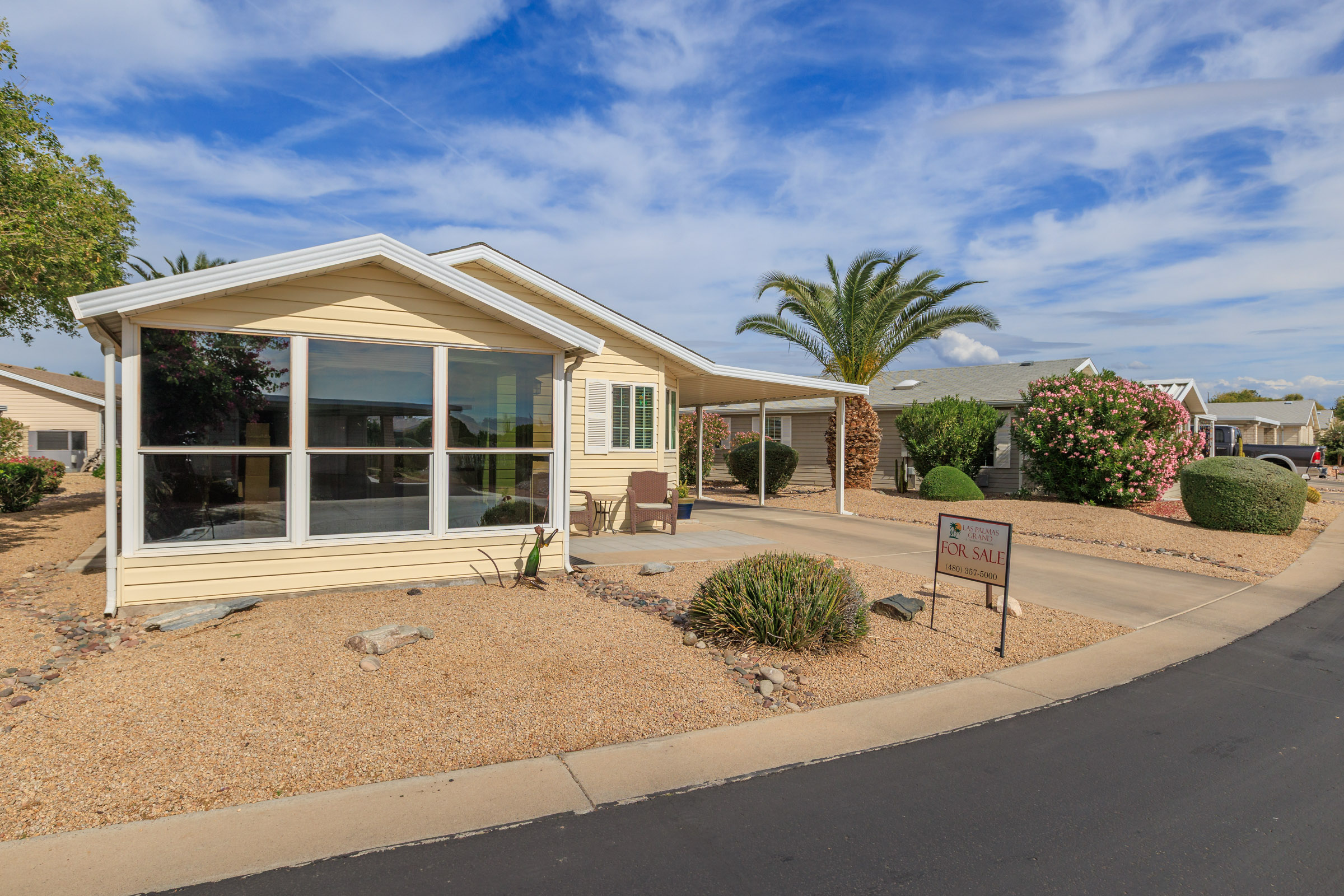Imagine stepping into this fresh, and fully remodeled, home! This adorable open-concept home comes with 2 bedrooms, 2 bathrooms, and features vaulted ceilings with skylights in the main living area. The gorgeous, bright and airy, kitchen boasts stainless steel appliances, a kitchen island, and ample storage. The guest bathroom has a walk-in jacuzzi tub/shower with all the bells and whistles! The indoor laundry area is equipped with extra countertop space for convenience. Enjoy year-round outdoor living in the glassed-in Arizona room, perfect for enjoying nature comfortably, relaxing, or entertaining. Call Today to tour our beautiful community and homes. 480-357-5000