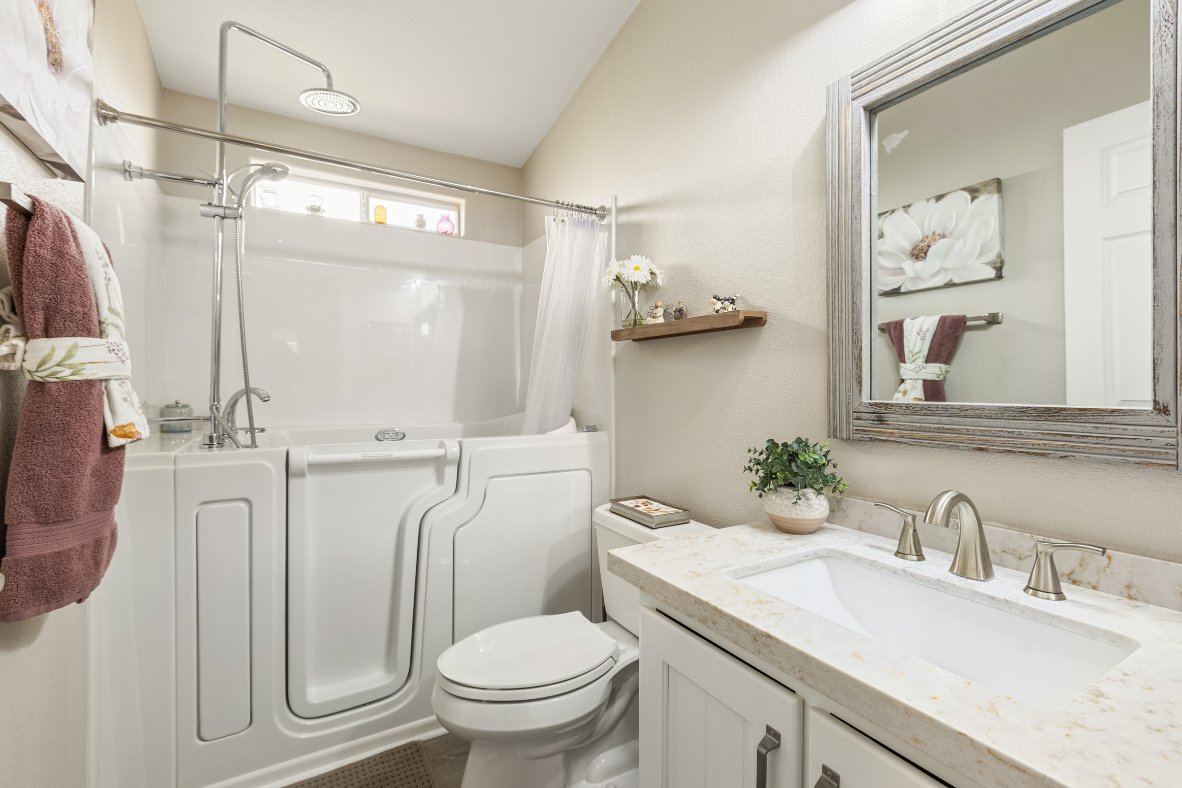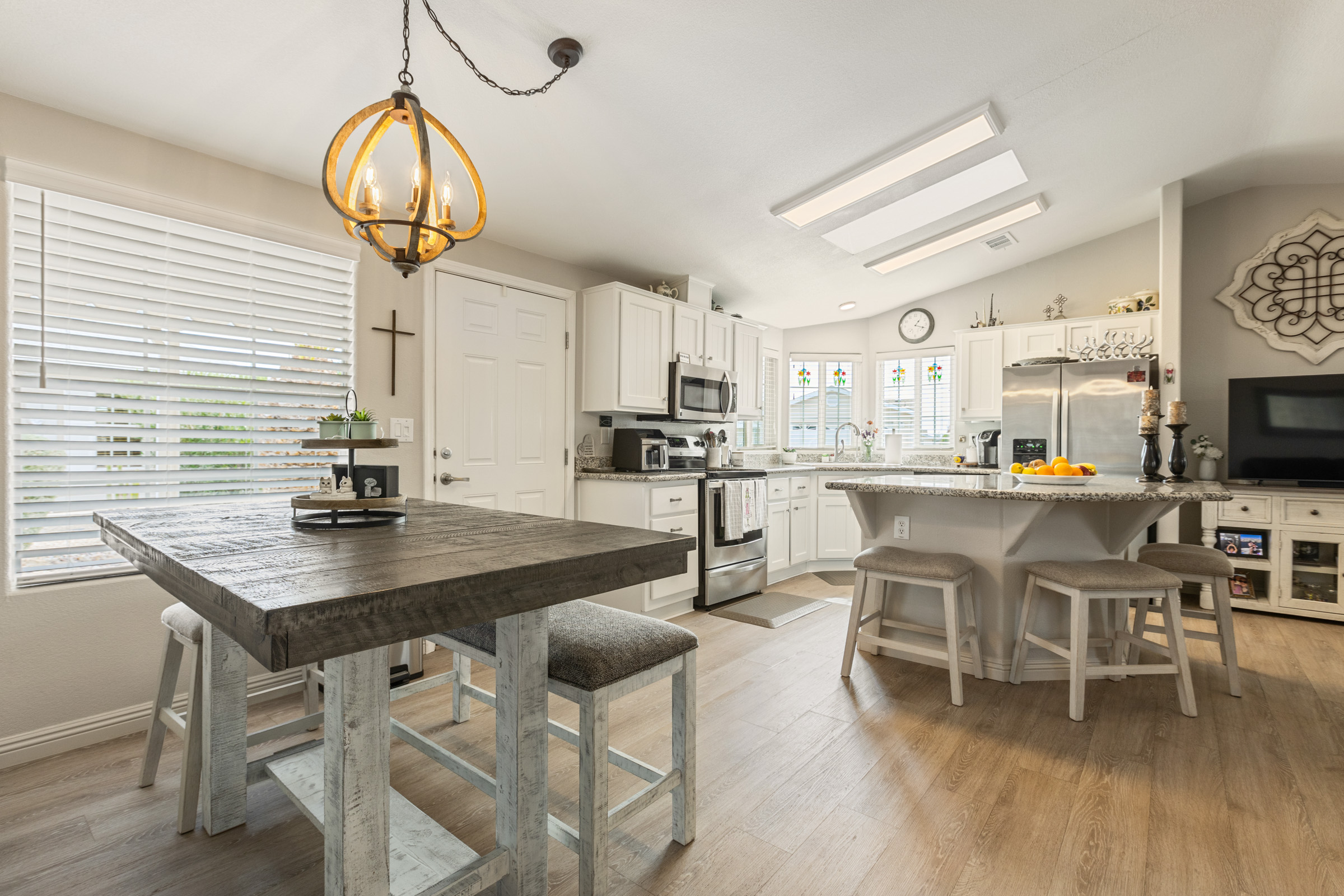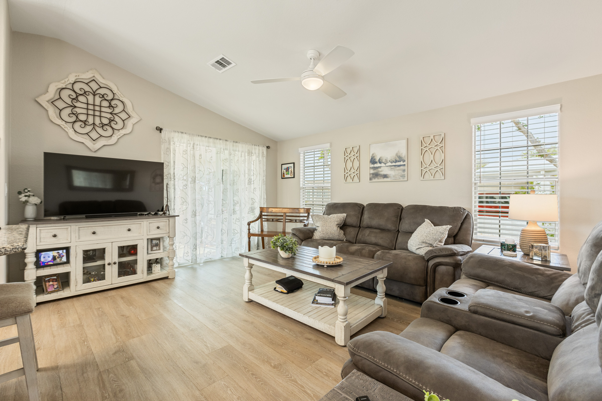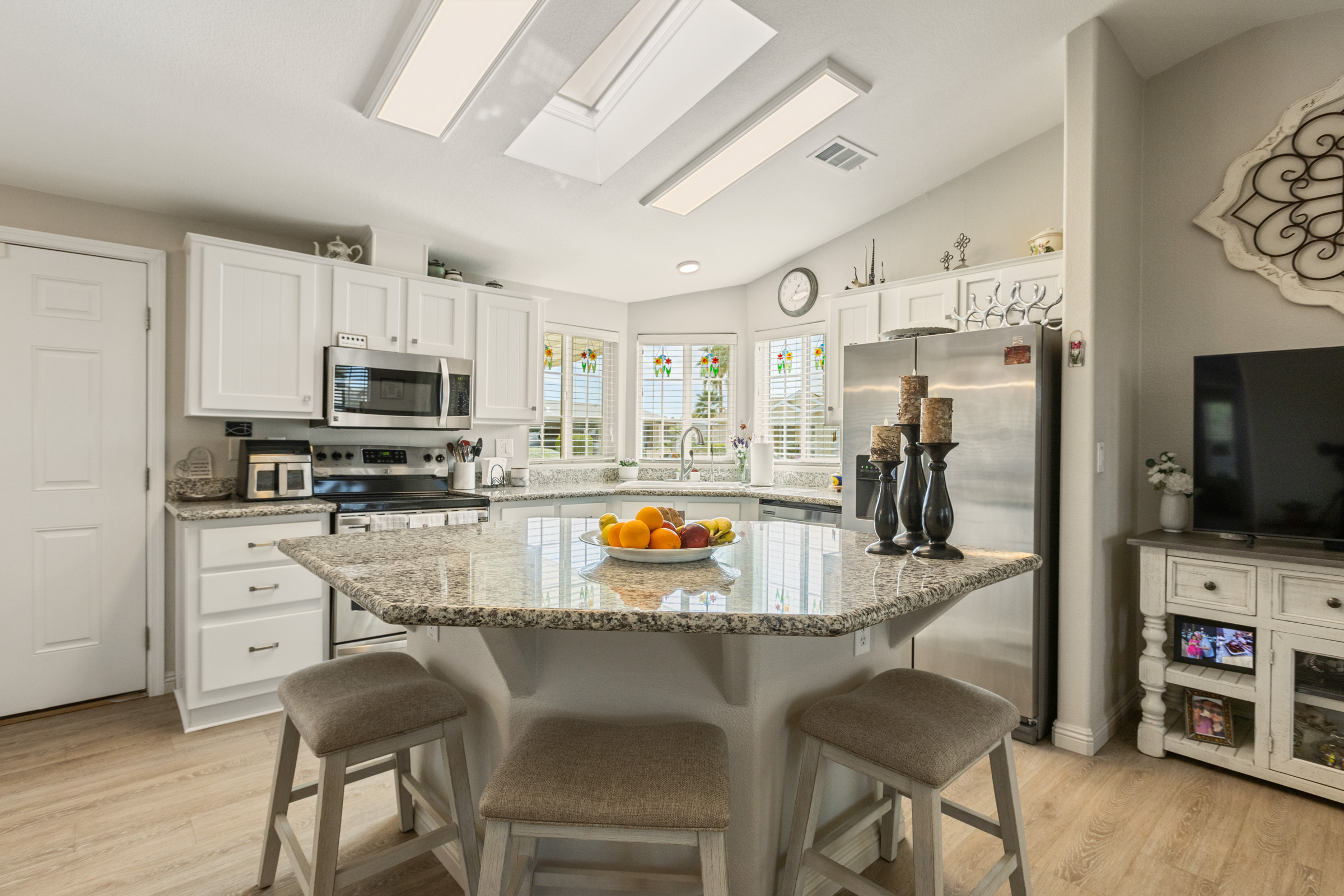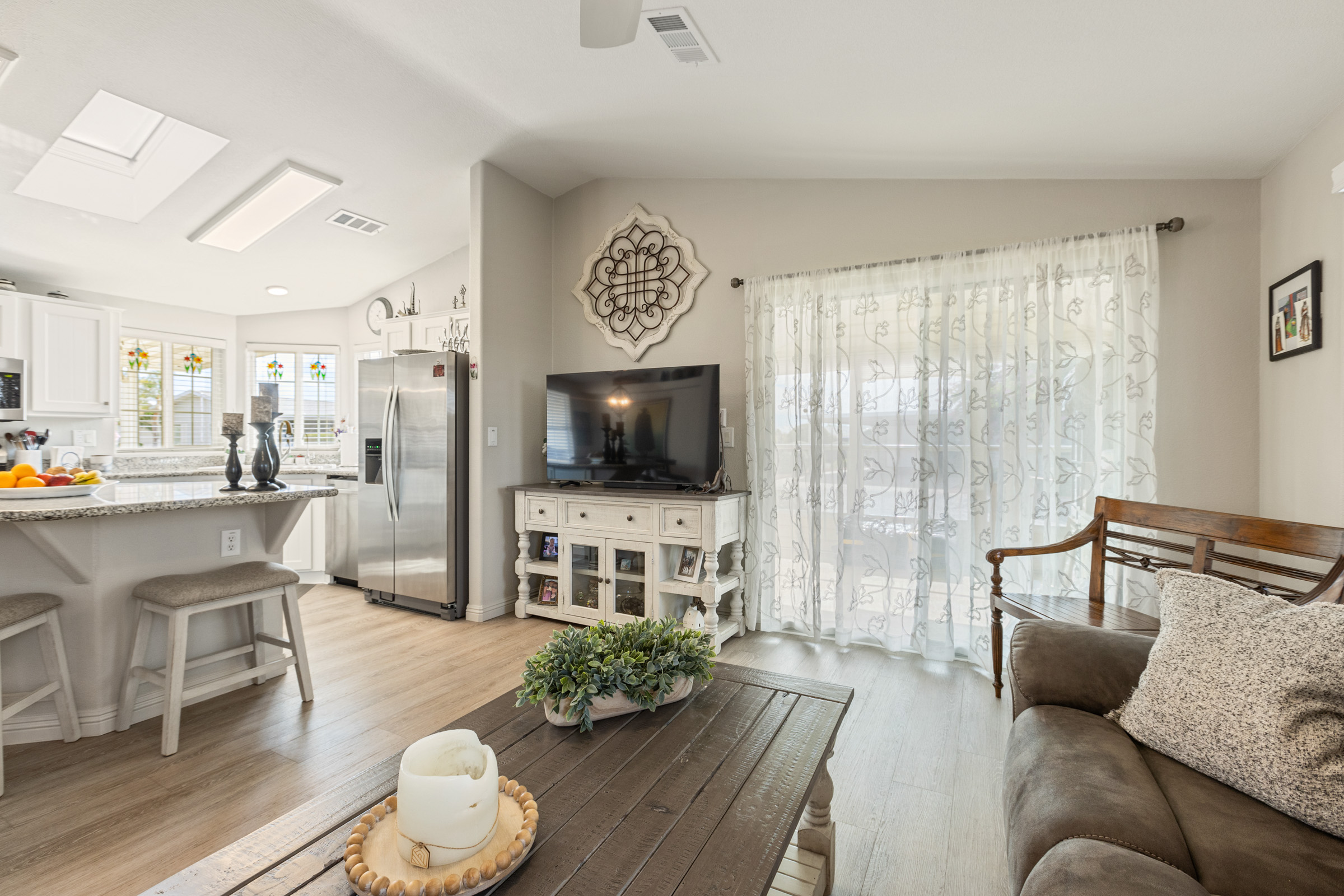 Imagine stepping into this fresh, and fully remodeled, home! This adorable open-concept home comes with 2 bedrooms, 2 bathrooms, and features vaulted ceilings with skylights in the main living area. The gorgeous, bright and airy, kitchen boasts stainless steel appliances, a kitchen island, and ample storage. The guest bathroom has a walk-in jacuzzi tub/shower with all the bells and whistles! The indoor laundry area is equipped with extra countertop space for convenience. Enjoy year-round outdoor living in the glassed-in Arizona room, perfect for enjoying nature comfortably, relaxing, or entertaining. Call Today to tour our beautiful community and homes. 480-357-5000