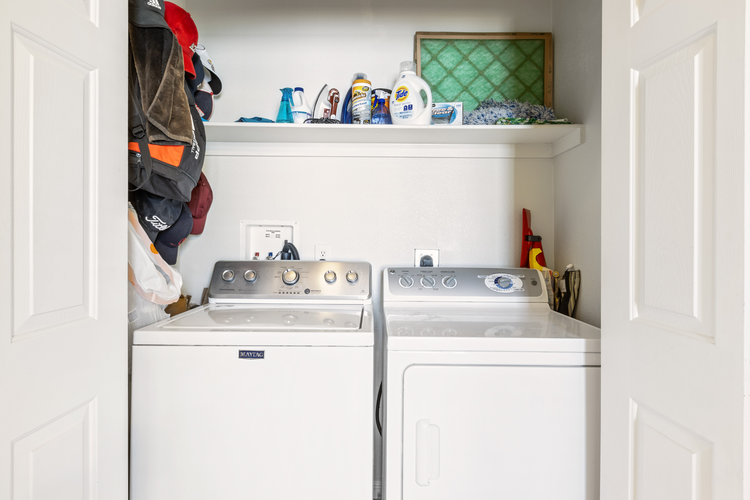 - Washer/dryer area, overhead shelf and built-in desk