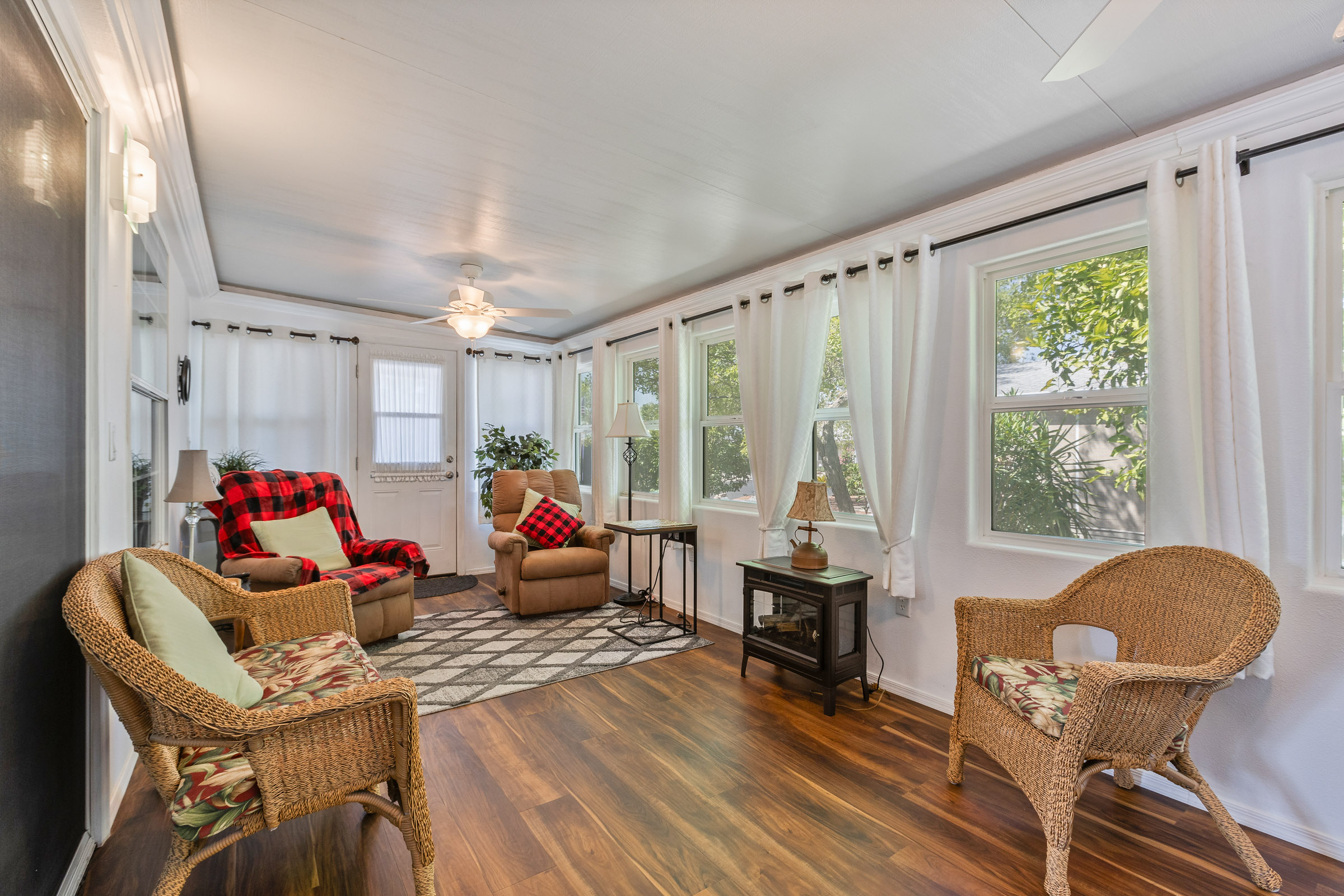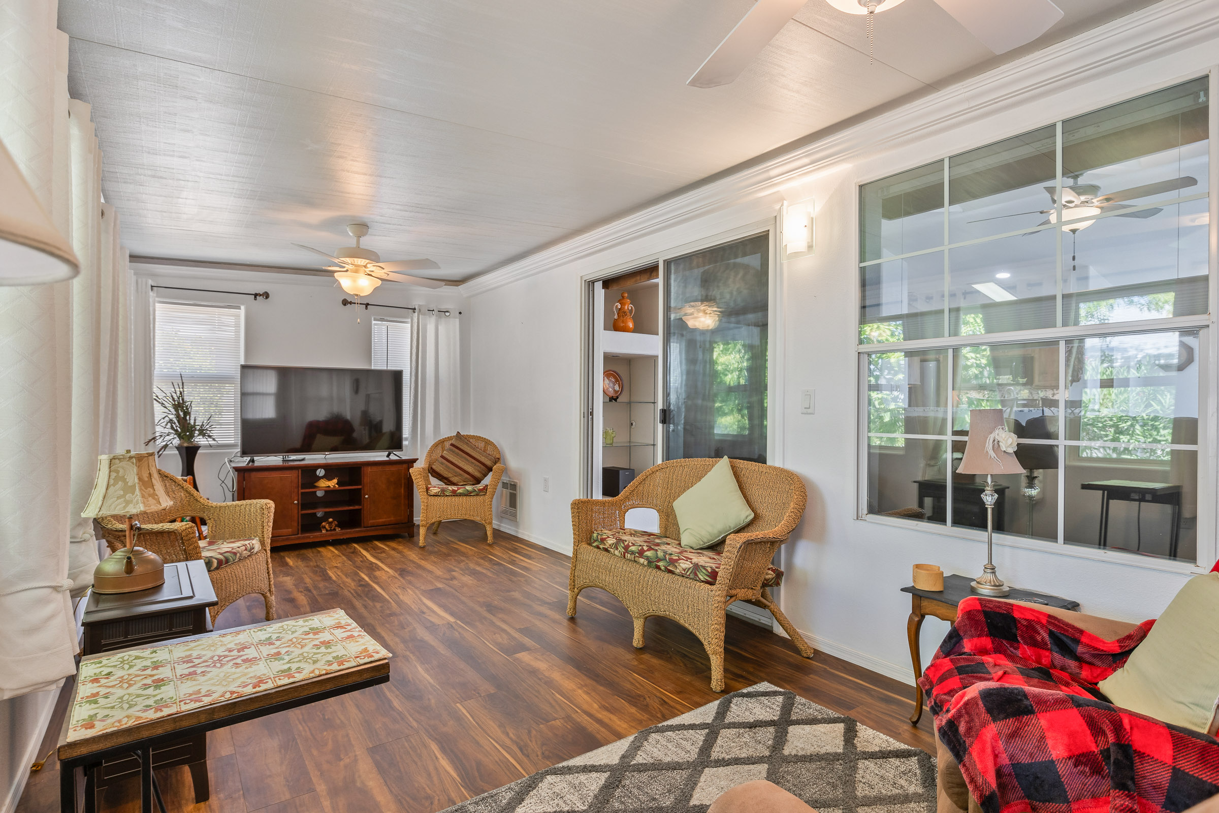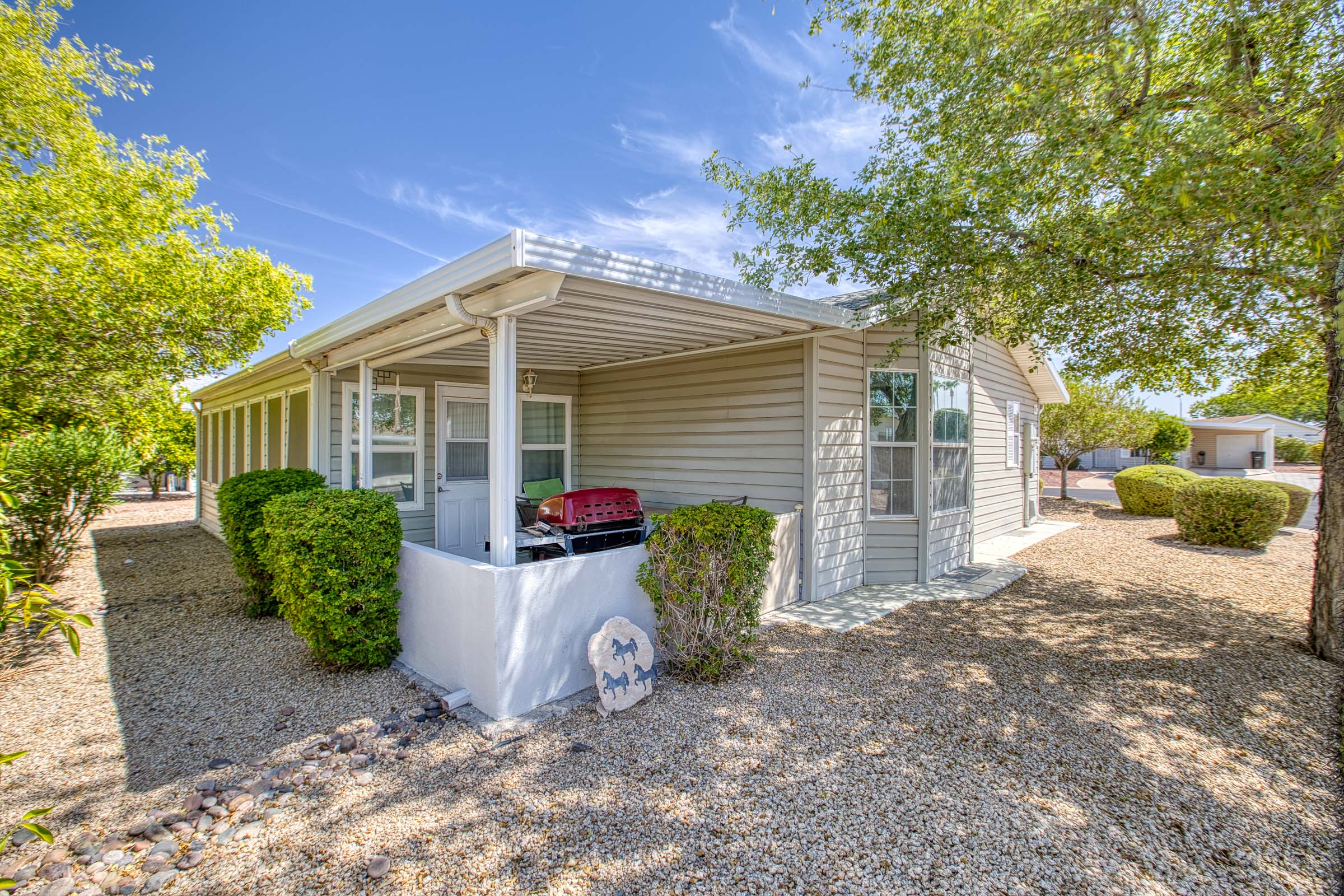 This 2 bedroom 2 bath home has lots of upgrades! Details are everywhere starting with the flooring, custom window treatments, security door, solar tubes, recessed lighting, 2 x 6 construction, leveled 2 years ago, beautiful granite in kitchen, custom cabinets with hardware, fans & lighting fixtures. Walk in tub and a bidet. Lovely patio. Az room vented from home so it can be an all seasons room for that extra space for a den, bedroom, office, crafts and so much more.