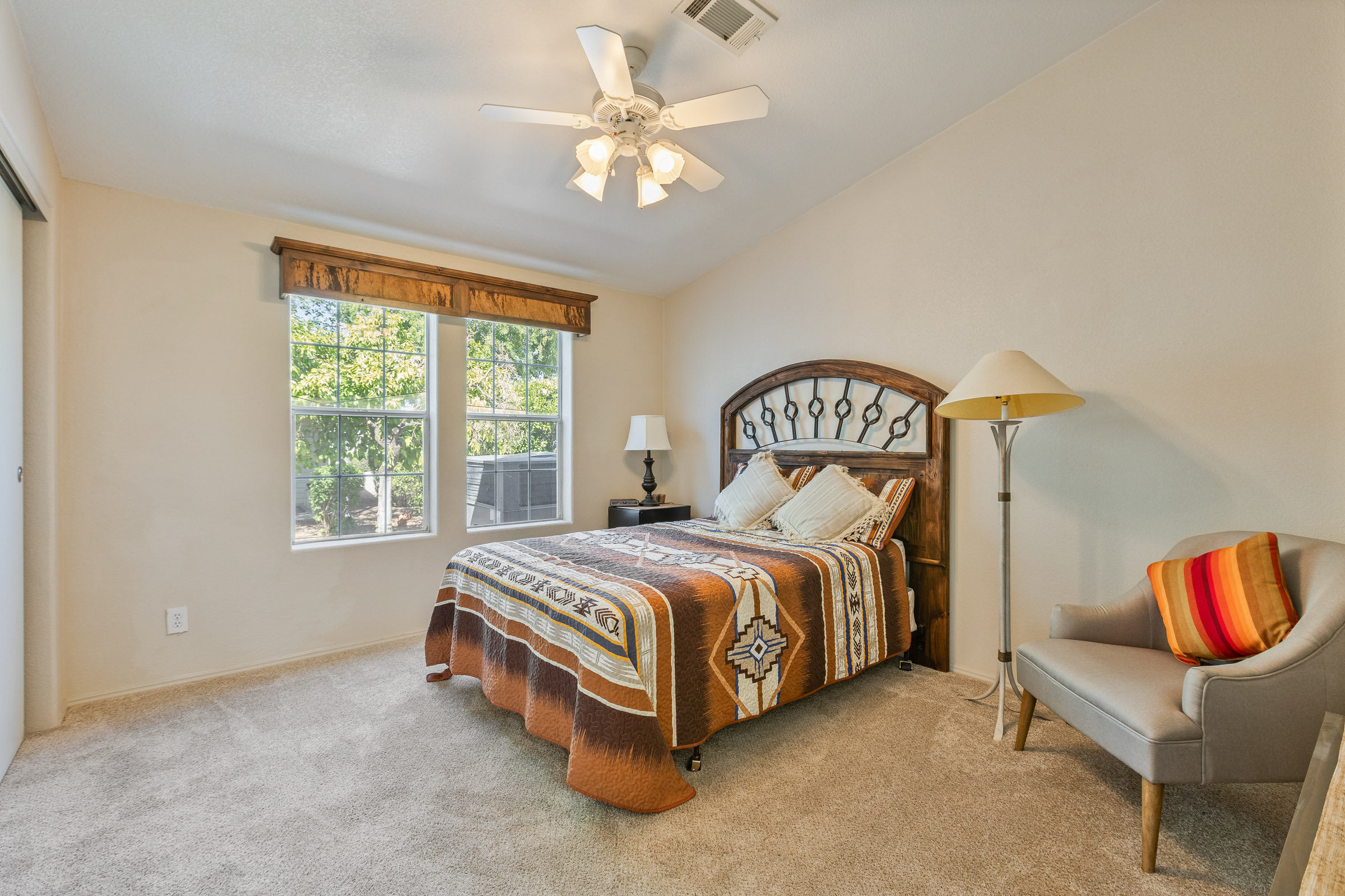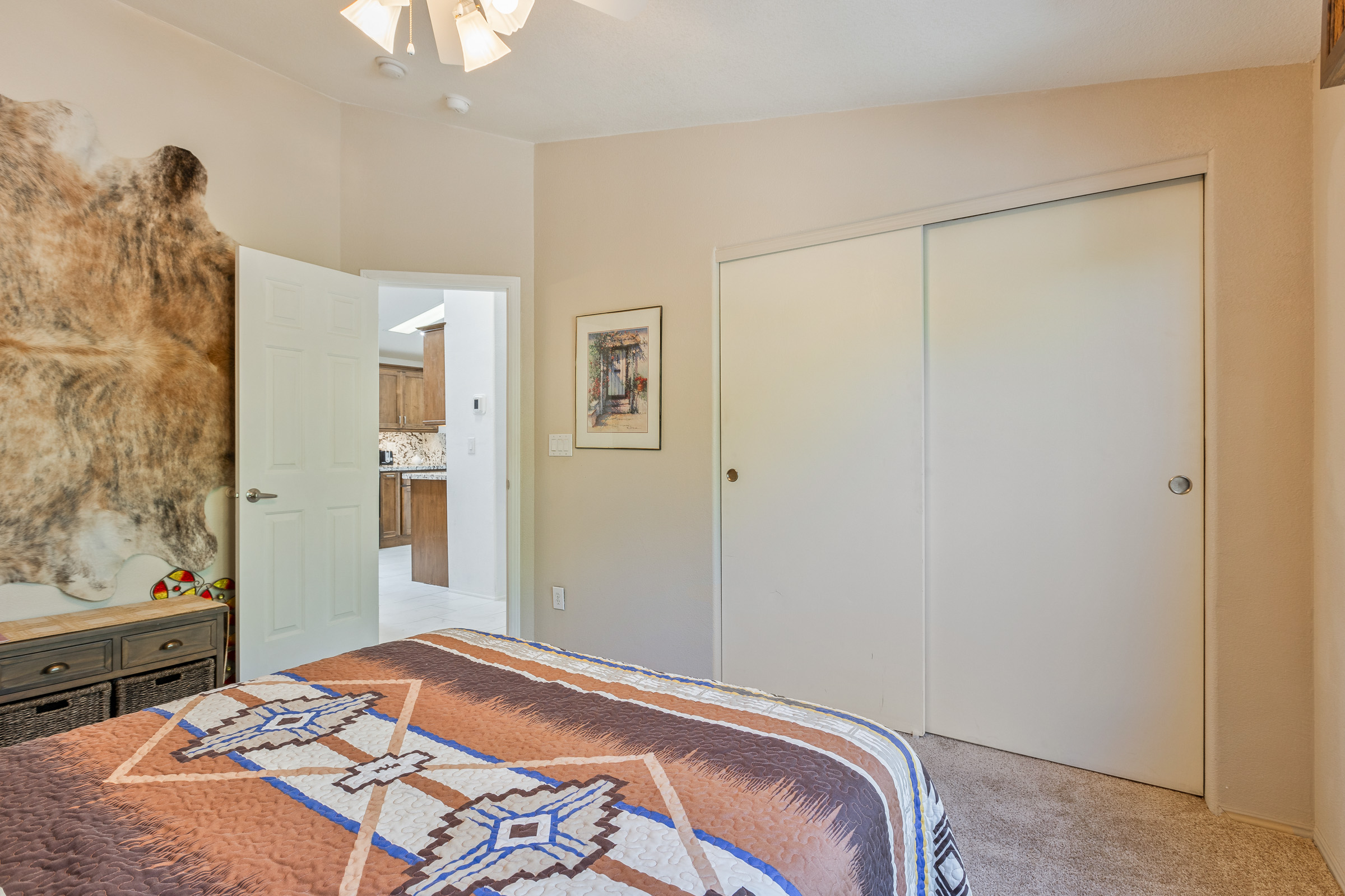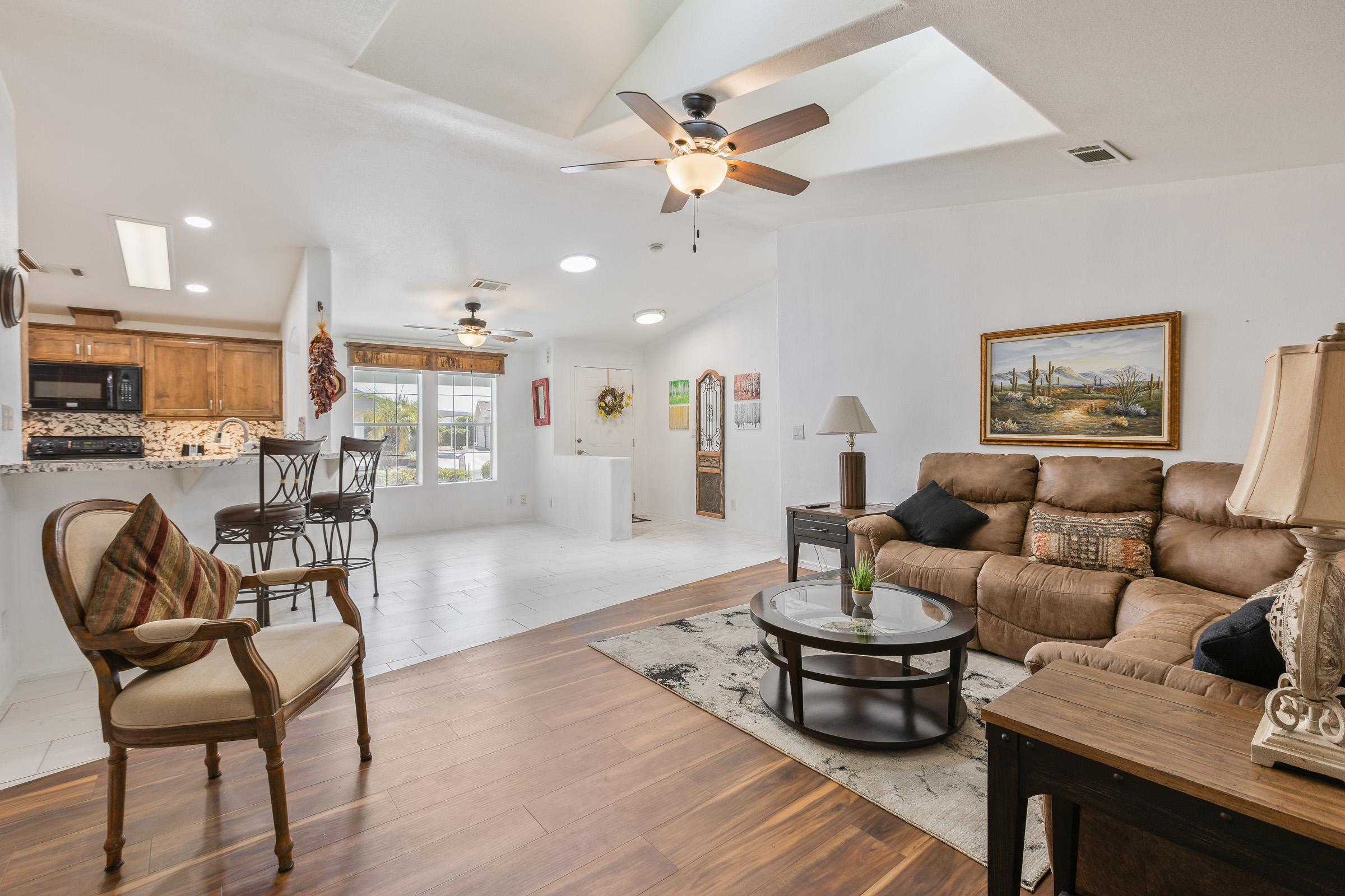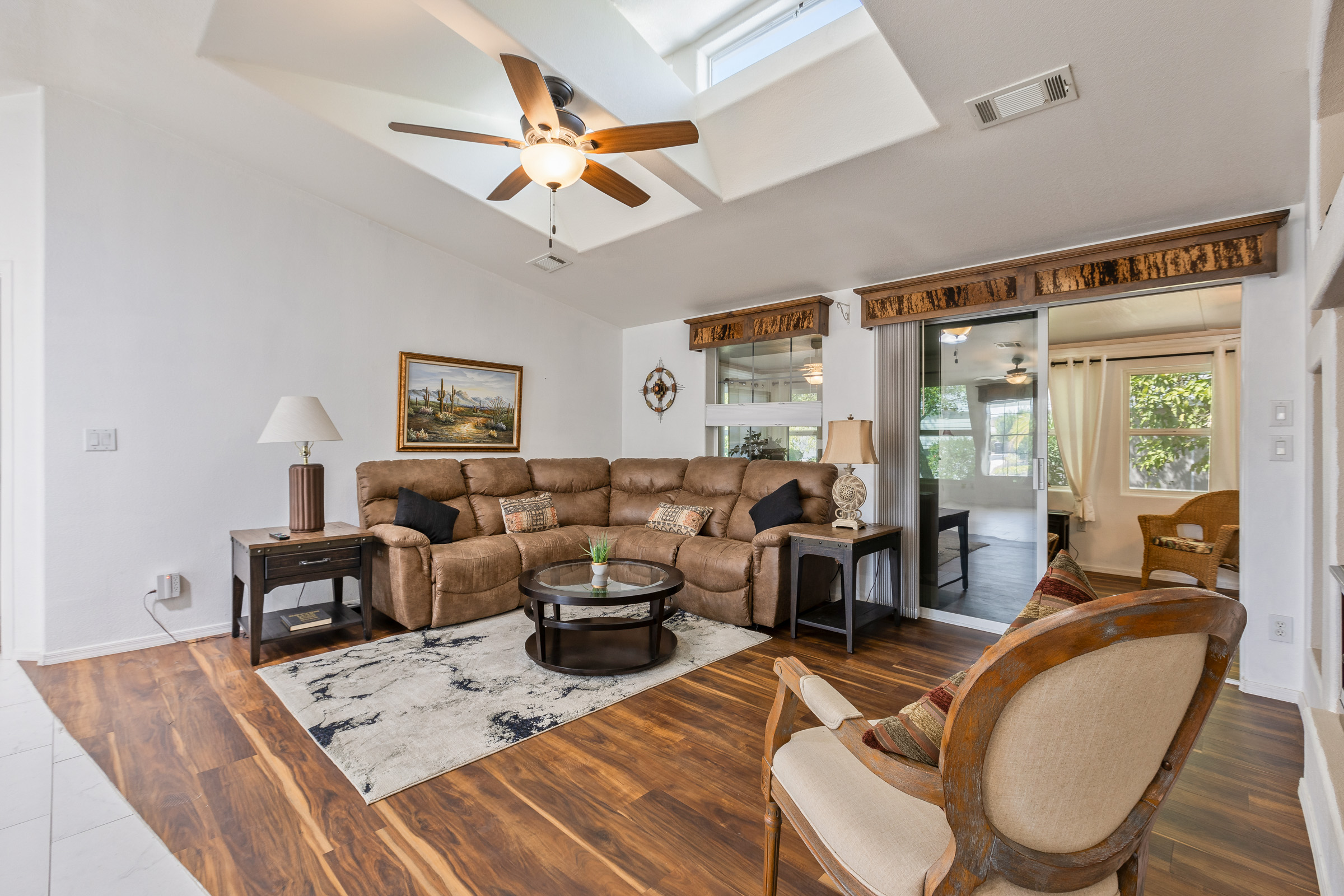 This 2 bedroom 2 bath home has lots of upgrades! Details are everywhere starting with the flooring, custom window treatments, security door, solar tubes, recessed lighting, 2 x 6 construction, leveled 2 years ago, beautiful granite in kitchen, custom cabinets with hardware, fans & lighting fixtures. Walk in tub and a bidet. Lovely patio. Az room vented from home so it can be an all seasons room for that extra space for a den, bedroom, office, crafts and so much more.