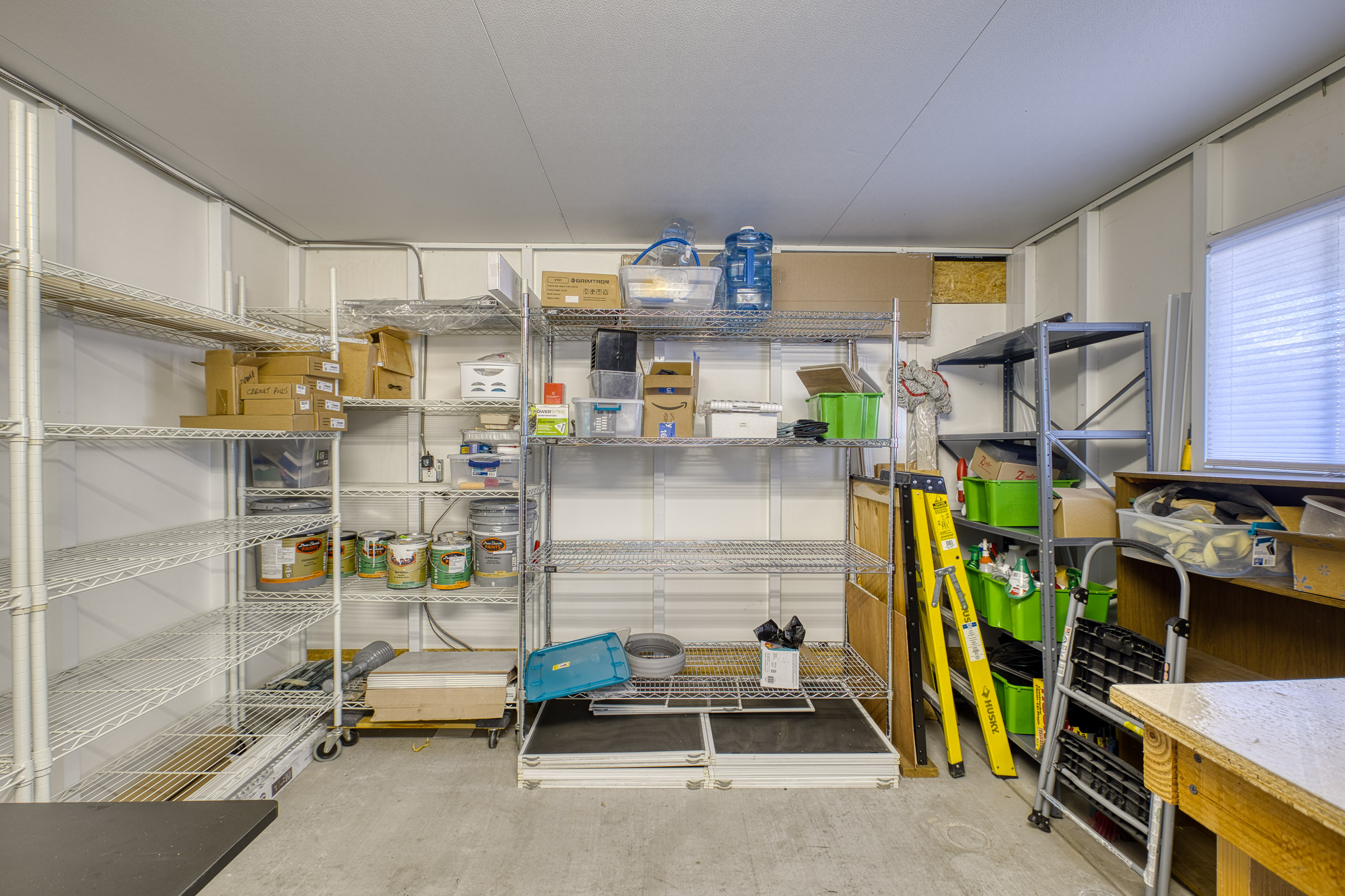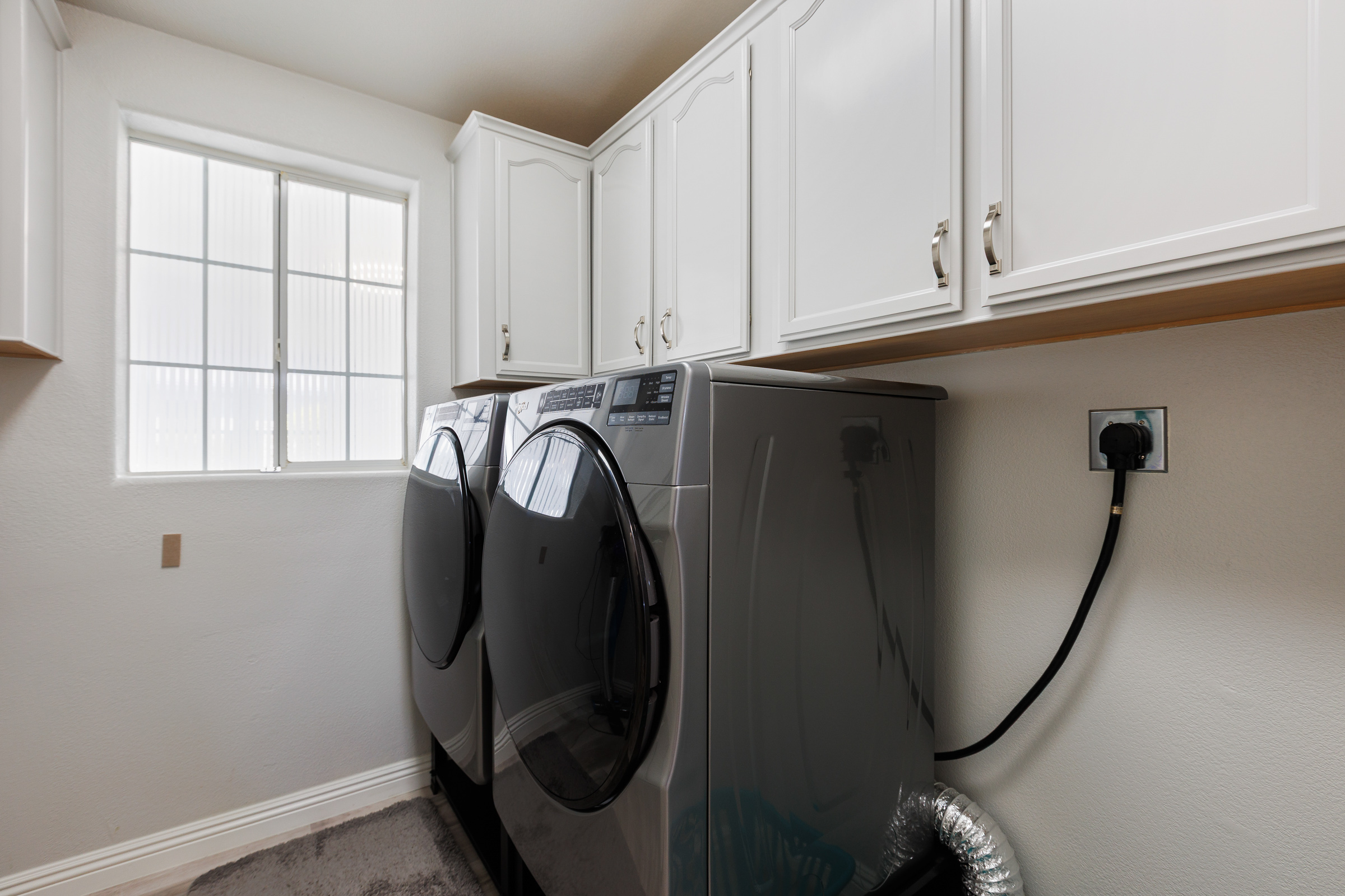 - Washer/dryer area, overhead shelf and built-in desk